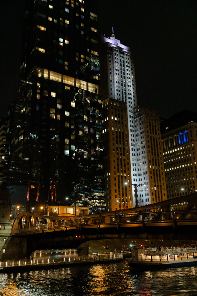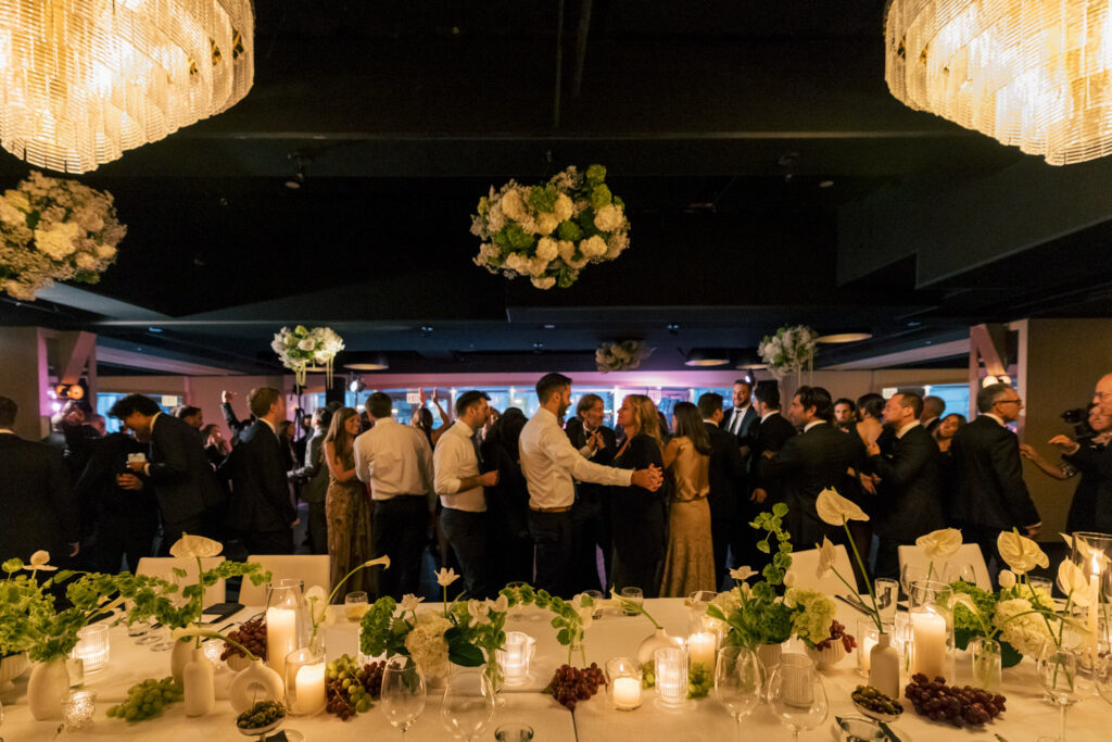 By the time dinner gave way to dancing, the tone had fully shifted from ceremony to celebration. Tequila shots were passed in hollowed-out limes. Espresso martinis made their way around the dance floor on silver trays. A multi-course meal turned into a packed dance floor without much transition at all. It felt intentional in the best way — thoughtful design, incredible food, and music loud enough that no one lingered in their seat for long. The Chicago River was glowing just outside, and Amy and Ian’s wedding became exactly what they wanted: a party for the people they love, carried late into the night.